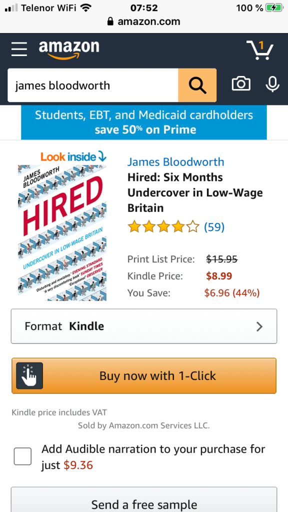 Tematisk, ser det ut som boka kunne vorte filmatisert av Ken Loach. (Som du kan lese meir om i dette blogginnlegget). Eg legg ho i handlekurven, ikke på Amazon.com, sjølv om ho ironisk nok kan kjøpast der. Fristande, med «one-click-but», som dei reklamerer med.