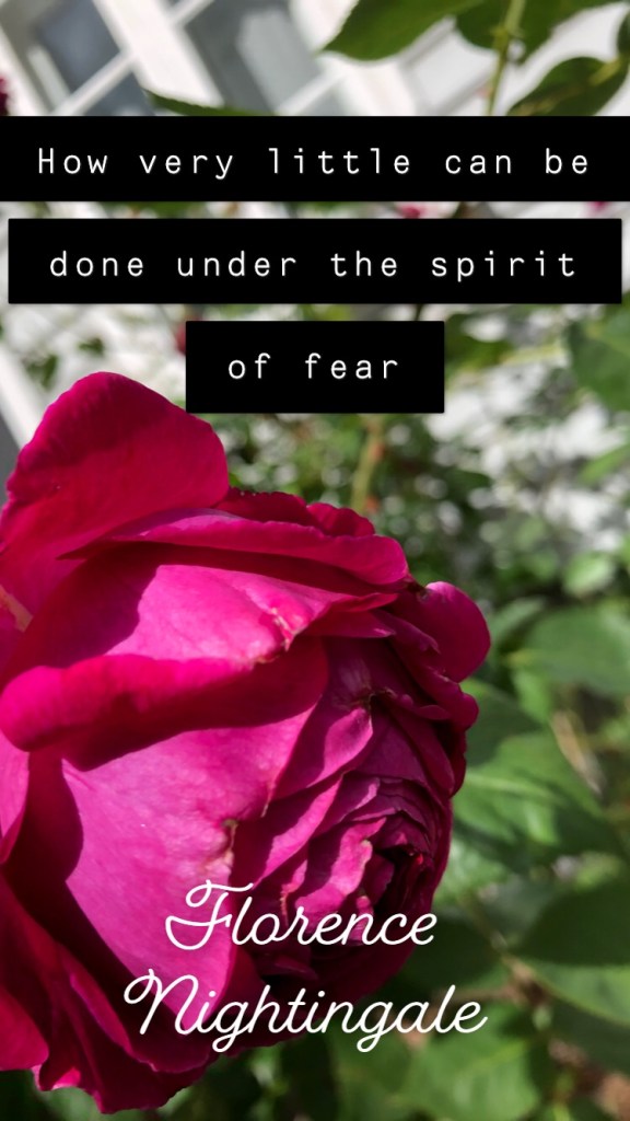 Eg tenkjer på Florence Nightingale. (Ja, det er faktisk slik at det finnes eit sitat av Flo, til ei kvar anledning). For som ho har sagt. «Me får gjort så lite, når redsla rår». (Mi oversetting)