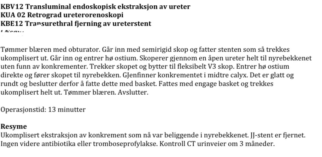 Jakten på nyresteinen er over. Operasjonsbeskrivelsen er full av koder som genererer drg-poeng, og dermed penger til budsjettet for dei som skal gjere jobben.