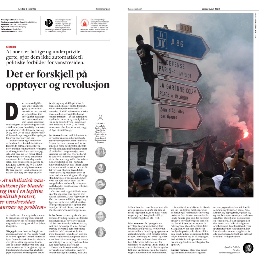 Men at noen er fattige og underprivilegerte, gjør dem likevel ikke automatisk til politiske forbilder for venstresiden, skriv Sandra Lillebø i laurdagens utgåve av Klassekampen. Dumumskap og egoisme er antakelig ganske jevnt fordelt i befolkningen, skriv ho, uavhengig av inntekt og sosial status. «Man undervurderer idiotien i en del av disse folkene», sier for eksempel en akuttlege i Saint-Denis til avisa Le Monde, etter å i flere dager ha tatt imot ungdommer som har skadet seg i sammenstøt med ordensmakten.