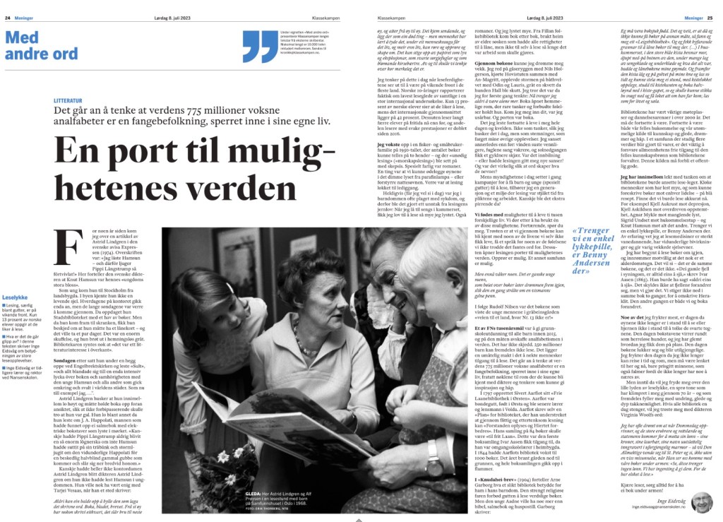 Forfattaren Inge Eidsvåg, skriv dette i eit ode til biblioteka. Til boka som følgesvenn. På trykk i Klassekampen sist laurdag. Han beskriv korleis han fekk lov å lese når arbeidet var utført, og når han var sjuk. Slik var han aldri aleine, og draumar om noko anna kom fram.