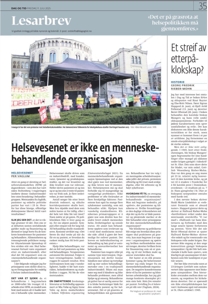 «Helsevesenet er ikke en menneske-behandlende organisasjon» sier Per Vaglum, prisvinnende professor emeritus og psykiater. Temaet for leserbrevet er NPM og, uregjerlige problemer, og hvordan helseforetaksmodellen særlig innen psykiatrifeltet over tid har vært svært destruktive.