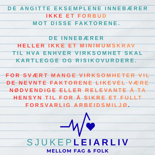 For svært mange virksomheter vil de nevnte faktorene likevel være nødvendige eller relevante å ta hensyn til for å sikre et fullt forsvarlig arbeidsmiljø.